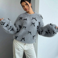 Damen New Herbst und Winter gestrickt grau Mohair Loose Overs ize Pullover 3D Bow Round Neck Sweater