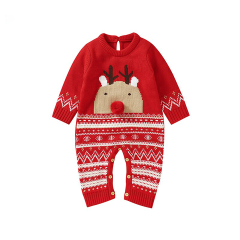 Mùa Đông OEM Tùy Chỉnh Bé Cô Gái Chàng Trai Giáng Sinh Màu Đỏ Tuần Lộc Jacquard Đan Bé Sơ Sinh Jumpsuit Giáng Sinh Áo Len