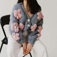 Biểu Tượng Tùy Chỉnh Thiết Kế Phụ Nữ Dệt Kim Tay Dệt Kim Phụ Nữ Áo Len Cardigans Hoa Handmade Chunky Đan Cardigan Áo Len
