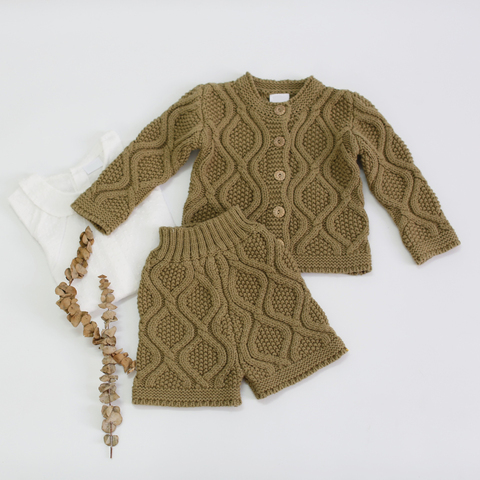 Tùy Chỉnh Mùa Thu Bé Dày Kim Xoắn Dài Tay Cardigan Top Quần Short Cotton 2 Mảnh Phù Hợp Với Chàng Trai Cô Gái Áo Len